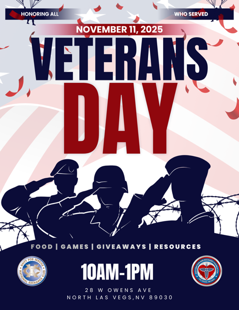 Date: November 11, 2025 Time: 10:00 AM - 1:00 PM Come together to honor our heroes with community, gratitude, and celebration. Bring your family and friends-let’s make this day memorable!